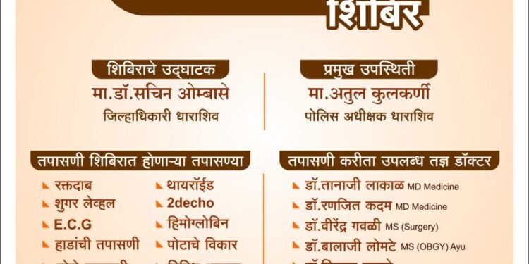 सदर शिबिर येडशी रोड, छायादीप मंगल कार्यालयासमोर पल्स मल्टीस्पेशालिटी हॉस्पिटल येथे होणार असून या शिबिराचे उद्घाटन जिल्हाधिकारी डॉ. सचिन ओंबासे यांच्या हस्ते होणार आहे. यावेळी प्रमुख उपस्थिती म्हणून जिल्हा पोलीस अधीक्षक अतुल कुलकर्णी, ज्येष्ठ पत्रकार अनंत अडसूळ, कमलाकर कुलकर्णी हे राहणार आहेत. या शिबिरामध्ये रक्तदाब, थायरॉईड, शुगर लेवल, ईसीजे, हिमोग्लोबिन, हाडांची तपासणी, पोटाचे विकार, डोळे तपासणी, तसेच लहान मुले, महिला तसेच कुटुंबातील सर्व सदस्यांची तपासणी करण्यात येणार आहे. या आरोग्य तपासणी शिबिरासाठी तज्ञ डॉक्टर म्हणून डॉ. तानाजी लाकाळ, डॉ. रणजीत कदम, डॉ. वीरेंद्र गवळी, डॉ. बालाजी लोमटे, डॉ. विकास बाराते, डॉ. नितीन भोसले, डॉ. पवन महाजन हे तपासणी करणार आहेत. या शिबिराचा पत्रकार तसेच वृत्तपत्र विक्रेते आणि त्यांच्या कुटुंबीयांनी लाभ घ्यावा, असे आवाहन धाराशिव जिल्हा पत्रकार संघाचे अध्यक्ष चंद्रसेन देशमुख, सरचिटणीस भीमाशंकर वाघमारे, पल्स मल्टीस्पेशालिटी हॉस्पिटलचे संचालक डॉ. तानाजी लाकाळ, डॉ. रणजीत कदम, जिल्हा पत्रकार संघाचे पदाधिकारी रवी केसकर, चेतन धनुरे, बाबुराव चव्हाण, देवीदास पाठक, महेश पोतदार, बालाजी निरफळ, सयाजी शेळके, तानाजी जाधवर, जी. बी.राजपूत, धाराशिव तालुकाध्यक्ष मच्छिंद्र कदम, अझर शेख, राजेंद्रकुमार जाधव, राकेश कुलकर्णी, प्रवीण पवार, बालाजी सुरवसे, प्रा. अभिमान हंगरकर, अमोल गाडे, शीतल वाघमारे, विकास सूर्डी, संजय पाटोळे, कालिदास म्हेत्रे, आरिफ शेख, सुधीर पवार, ज्ञानेश्वर पाटील, ओंकार कुलकर्णी, संजय शिंदे, शिवराज गव्हाणे, पाडूरंग पवार यांच्यासह सर्व आठही तालुका कार्यकारिणी सदस्यांनी केले आहे.