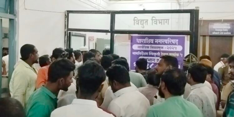पालिका निवडणुकीसाठी उमेदवारी अर्ज दाखल करण्याचा आज अखेरचा दिवस असल्याने धाराशिव नगरपालिका परिसरात सकाळपासूनच प्रचंड धांदल, गडबड आणि पळापळ पाहायला मिळत आहे. उमेदवारी दाखल करण्यासाठी अवघे काही तास शिल्लक असताना इच्छुक उमेदवार आणि कार्यकर्त्यांनी पालिकेच्या आवारात मोठी गर्दी केली आहे.