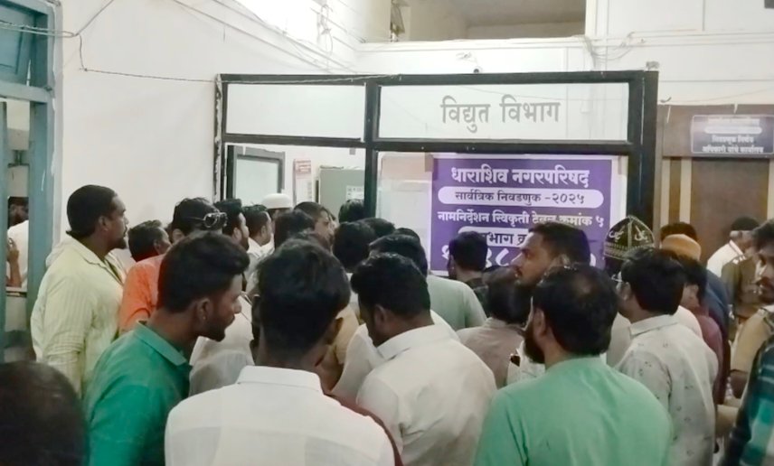 पालिका निवडणुकीसाठी उमेदवारी अर्ज दाखल करण्याचा आज अखेरचा दिवस असल्याने धाराशिव नगरपालिका परिसरात सकाळपासूनच प्रचंड धांदल, गडबड आणि पळापळ पाहायला मिळत आहे. उमेदवारी दाखल करण्यासाठी अवघे काही तास शिल्लक असताना इच्छुक उमेदवार आणि कार्यकर्त्यांनी पालिकेच्या आवारात मोठी गर्दी केली आहे.