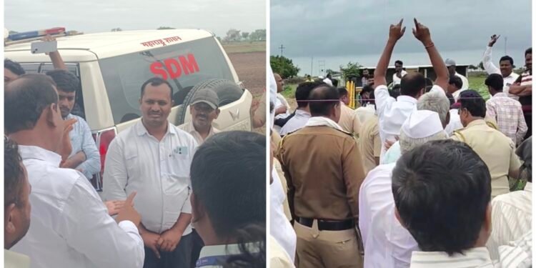 तसेच मावेजा किती मिळणार याबद्दलही आम्हाला विश्वासात घेतले नसल्याचे सांगत विरोध दर्शवला. यावेळी पोलिसांनी हस्तक्षेप करत शेतकऱ्यांना धमकावण्यास सुरुवात केली. त्यानंतर काही वेळ बाचाबाची झाली. यावेळी शेतकऱ्यांनी उपस्थित अधिकाऱ्यांच्या समोर लोटांगण घेत आल्या पावली परत जाण्याची विनंती केली.