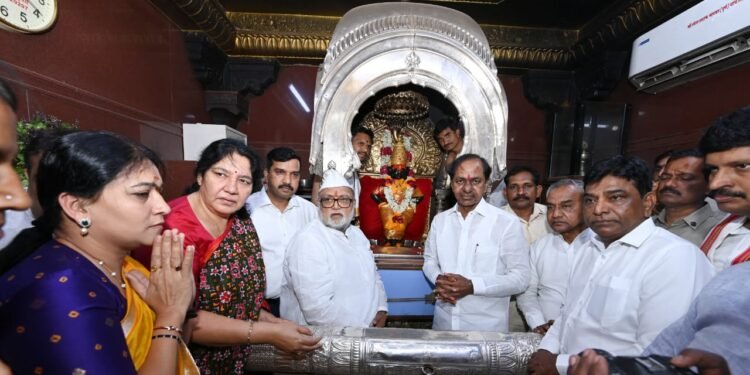 तेलंगणाचे मुख्यमंत्री के चंद्रशेखर राव यांनी आज विठ्ठल रुक्मिणीचे दर्शन घेतलं. त्यांच्यासोबत काही सहकाऱ्यांनी देखील विठ्ठल रुक्मिणीचे दर्शन घेतलं. तर मंत्र्यांसह, आमदार खासदारांना मात्र बाहेरुनच नामेदव पायरीचे दर्शन घ्यावं लागलं. पंढरपुरात वारकऱ्यांची मोठी गर्दी असल्यामुळं मोजक्याच कोअर कमिटीच्या लोकांनी के चंद्रशेखर राव यांच्यासोबत मंदिरात सोडण्यात आलं होतं.