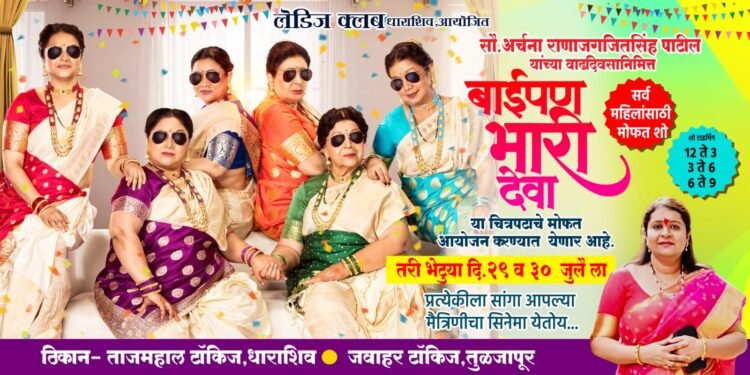 महिलांच्या जीवनावर आधारित असलेल्या ‘बाईपण भारी देवा’, या चित्रपटाला महिला वर्गामध्ये प्रचंड लोकप्रियता मिळाली आहे. महिला वर्गाला निखळ आनंद मिळवून देणारा हा चित्रपट इच्छा असूनही अनेक महिलांना गर्दीमुळे किंवा विविध अडचणीमुळे पाहता येत नव्हता. अनेक ठिकाणी चित्रपटाचे शो हाऊसफुल्ल होत आहेत.त्यामुळे लेडीज क्लबने धाराशिवसह तुळजापूर आणि कळंब शहरातील चित्रपटगृहात हा चित्रपट मोफत दाखविण्याचा निर्णय घेतला आहे.महिलांनी या मोफत चित्रपटाचा लाभ घ्यावा, असे आवाहन सौ.पाटील यांनी केले आहे. धारशिव शहरातील ताजमहल टॉकीज, तुळजापूर शहरात जवाहर टॉकीज आणि कळंब येथील पृथ्वीराज चित्र मंदिरमध्ये हे शो दाखविण्यात येणार आहेत. लेडीज क्लबच्या वतीने दरवर्षी महिलांसाठी सामाजिक तसेच सांस्कृतिक कार्यक्रम आयोजित करण्यात येतात. या कार्यक्रमामुळे महिलांना सांस्कृतिक पर्वणी मिळते.