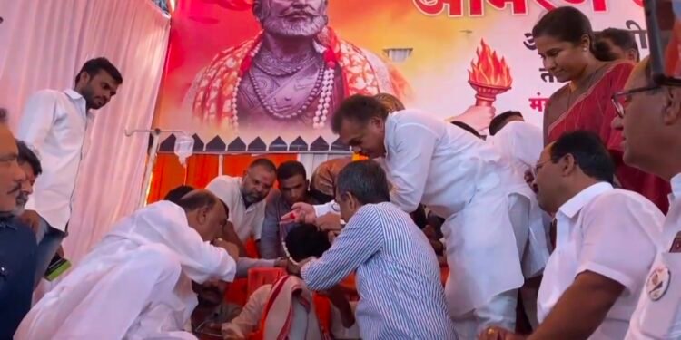 मराठा आरक्षणासाठी मनोज जरांगे पाटील यांचे 6 दिवसांपासून उपोषण सुरू होते. महाराष्ट्रातील वेगवेगळ्या पक्षाच्या लोकप्रतिनिधींनी त्यांची भेट घेऊन पाठिंबा दिला होता.तसेच त्यांच्या प्रकृतीबद्दल चिंता व्यक्त केली जात होती. बार्शीचे आमदार राजाभाऊ राऊत यांनी तीन दिवसांपासून मनोज जरांगे आणि राज्य सरकारमध्ये सकारात्मक चर्चा घडवून आणण्याचा प्रयत्न केला. अखेर बुधवारी सायंकाळी तुळजापूरचे आमदार राणा जगजीतसिंह पाटील, औसाचे आमदार अभिमन्यू पवार यांनी मुख्यमंत्री एकनाथ शिंदे यांची भेट घेऊन उपोषणावर तातडीने तोडगा काढण्याची विनंती केली. त्यानंतर मुख्यमंत्री एकनाथ शिंदे यांनी राज्य मंत्रिमंडळाचे सदस्य म्हणून शंभूराजे देसाई तसेच आमदार राणा पाटील, आमदार राजाभाऊ राऊत यांच्या शिष्टमंडळाला आज अंतरवाली सराटीमध्ये जाऊन चर्चा करण्याची सूचना केली. त्यानुसार दुपारी शंभूराजे देसाई,खासदार संदीपान भुमरे, आमदार राणा जगजीतसिंह पाटील, आमदार राजाभाऊ राऊत यांच्या शिष्टमंडळाने मनोज पाटील यांची भेट घेऊन चर्चा केली. या चर्चेदरम्यान मनोज जरांगे पाटील यांनी त्यांच्या मागण्या समोर ठेवल्या. तसेच 30 जूनपर्यंत मागण्या मान्य करण्याची अपेक्षा व्यक्त केली. मात्र शंभूराज देसाई यांनी एक महिन्याची मुदत मागितल्याने जरांगे यांनी एक महिन्याची मुदत देऊन आपले उपोषण स्थगित केले. सहा दिवसांपासून सुरू असलेले जरांगे पाटील यांचे उपोषण तूर्त थांबल्याने मराठा समाज बांधवातून समाधान व्यक्त होत आहे. जरांगे पाटील यांची प्रकृती दिवसेंदिवस खालावत चालल्याने चिंता व्यक्त केली जात होती. दरम्यान राज्य सरकारच्या शिष्टमंडळाला शिष्टाई करण्यात यश आल्याने समाधान व्यक्त होत आहे. पाणी घेऊन जरांगे यांनी उपोषण स्थगित केल्यानंतर आई तुळजाभवानीचे आशीर्वाद कायम सोबत राहावेत, म्हणून आमदार राणा पाटील यांनी जरांगे पाटील यांच्या गळ्यात कवड्याची माळ गळ्यात घातली.त्यानंतर जय भवानी,जय शिवराय अशा घोषणांनी परिसर दणाणून गेला.