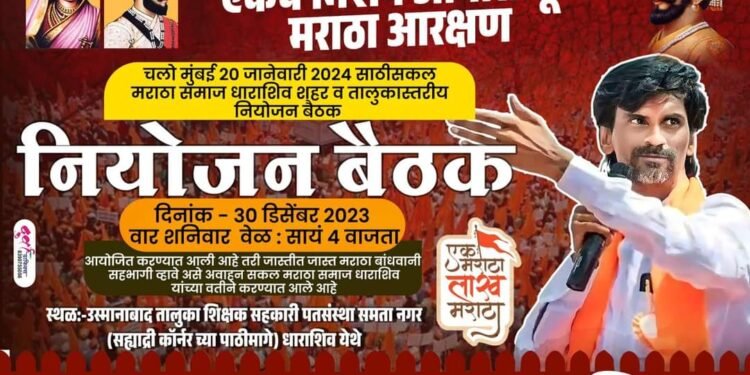मराठा समाजाच्या वतीने त्यासाठी बैठकीचे आयोजन करण्यात येत आहे. शुक्रवारी कळंब येथे बैठक आयोजित करण्यात आली आहे तर शनिवारी दुपारी चार वाजता धाराशिव शहरात तालुका शिक्षक सहकारी सहकारी पतसंस्थेत (समता नगर) बैठक आयोजित करण्यात आली आहे. या बैठकीत मुंबईतील आंदोलनाची माहिती तसेच पायी चालत जाताना मार्गावरील नियोजन यासंदर्भात चर्चा केली जाणार आहे. बैठकीला उपस्थित राहण्याचे आवाहन सकल मराठा समाजाच्या वतीने करण्यात आले आहे.आता नाही तर पुन्हा कधीच नाही म्हणत समाज माध्यमावर आंदोलनात सहभागी होण्याचे आवाहन करण्यात येत आहे.