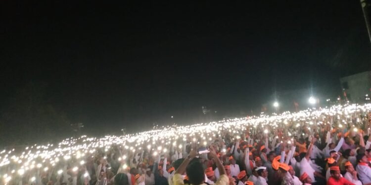 कर्मवीर मामासाहेब जगदाळे महाविद्यालयाच्या मैदानावर बुधवार (दि. १५) सकाळी अकरा वाजता होणारी सभा रात्री आठ वाजता सुरू झाली. सभेला 9 तास उशीर होऊनही मराठा समाजबांधव सभेला मोठ्या संख्येने उपस्थित होते. त्यांचा उत्साह आणि आनंद कायम होता.यावेळी 100 जेसीबीमधून फुलांची उधळण करत व माळी समाज बांधवांच्या वतीने 1 टन फुलांचा हार घालून पाटील यांचे स्वागत करण्यात आले. विशेष म्हणजे माळी समाज बांधवांना नाशिक भागातून काही लोकांनी सत्कराबद्दल जाब विचारत माळी यांना धमक्या दिल्या होत्या. मात्र बांधवानी धमक्यांना भीक न घालता जारांगे यांचा जंगी सत्कार केला. यावेळी उपस्थितांना मार्गदर्शन करताना मनोज जरांगे पाटील म्हणाले, एकवटलेला मराठा पाहायचा असेल तर या सभेकडे पहा आणि ही गर्दी बघून तरी सरकारने 24 डिसेंबरच्या अगोदर मराठ्यांना आरक्षण द्या. आपल्याला कुणबी मराठा म्हणून ५० टक्क्यातूनच आरक्षण घ्यायचे असून ते मिळणारच आहे. फक्त आपला हा लढा असाच एकजुटीने सुरू राहु द्या आणि एकमेकात मतभेद होऊ न देण्याचे आवाहन त्यांनी यावेळी केले. आपलीच काही लोक आपल्या विरोधात उभी केली जात असून आपल्याला भडकवण्याचा प्रयत्न केला जात आहे. त्यामुळे आपले आंदोलन शांततेत होऊ द्या , आत्महत्या करू नका आणि गावागावात जाऊन जनजागृती करा, असे आवाहन त्यांनी समाजबांधवांना केले. २४ डिसेंबरपर्यंत आरक्षण न मिळाल्यास पुढील रणनीती जाहीर करणार असल्याचे यावेळी सांगितले. राष्ट्रगीताने सभेची सांगता करण्यात आली.