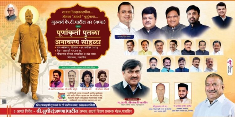 आदर्श शिक्षण प्रसारक मंडळाचे संस्थापक, शिक्षणमहर्षी गुरुवर्य के.टी. पाटील उर्फ बप्पा यांच्या जयंतीनिमित्त आज सोमवारी सकाळी 11 वाजता धाराशिव शहरातील श्रीपतराव भोसले हायस्कूलच्या प्रांगणात पुतळ्याचे अनावरण करण्यात येणार असून, या सोहळ्याला राज्याचे उपमुख्यमंत्री देवेंद्र फडणवीस, आरोग्यमंत्री तथा जिल्ह्याचे पालकमंत्री डॉ. तानाजी सावंत यांच्यासह विविध मान्यवर उपस्थित राहणार आहेत. तसेच महाराष्ट्राची हास्यजत्रा या कार्यक्रमासोबतच सांस्कृतिक कार्यक्रम आयोजित करण्यात आले आहेत.