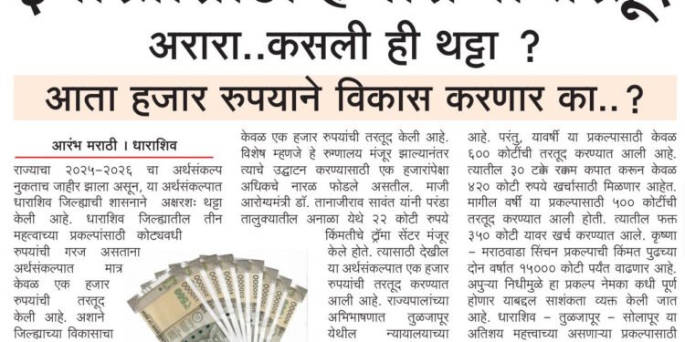 राज्याचा 2025-2026 चा अर्थसंकल्प नुकताच जाहीर झाला असून, या अर्थसंकल्पात धाराशिव जिल्ह्याची शासनाने अक्षरशः थट्टा केली आहे. धाराशिव जिल्ह्यातील तीन महत्वाच्या प्रकल्पांसाठी कोट्यवधी रुपयांची गरज असताना अर्थसंकल्पात मात्र केवळ एक हजार रुपयांची तरतूद केली आहे. अशाने जिल्ह्याच्या विकासाचा अनुशेष कसा भरून येणार हा प्रश्न निर्माण होत आहे.