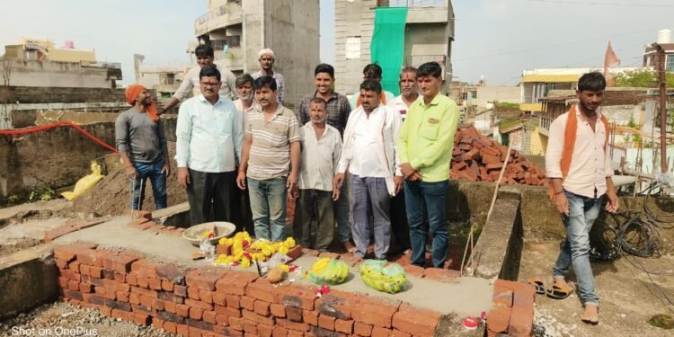 शहरातील लक्ष्मी रोडवरील वरच्या जुन्या वेस येथील हनुमान मंदिराच्या शिखर-कळस बांधकामाचा शुभारंभ रविवारी (दि.३०) करण्यात आला. मंदिरावरील स्लॅबपासून ३१ फूट उंच शिखर बांधकाम होणार आहे. या शिखर बांधकाम शुभारंभावेळी शहरातील नागरिक मोठ्या संखेने उपस्थित होते.